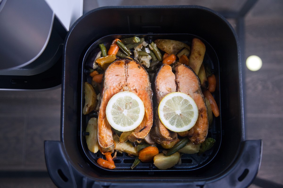 Что особенно радует – еда доходит до нужной кондиции быстро. Мы запекли овощи, куриное филе и стейки из тунца. На приготовление мяса ушло около 20 минут, на овощи – 12 минут. Блюда получились вкусными, золотистая корочка – на месте. И при этом не чувствуется никакого запаха пластика, как это иногда бывает с дешевыми аэрогрилями.